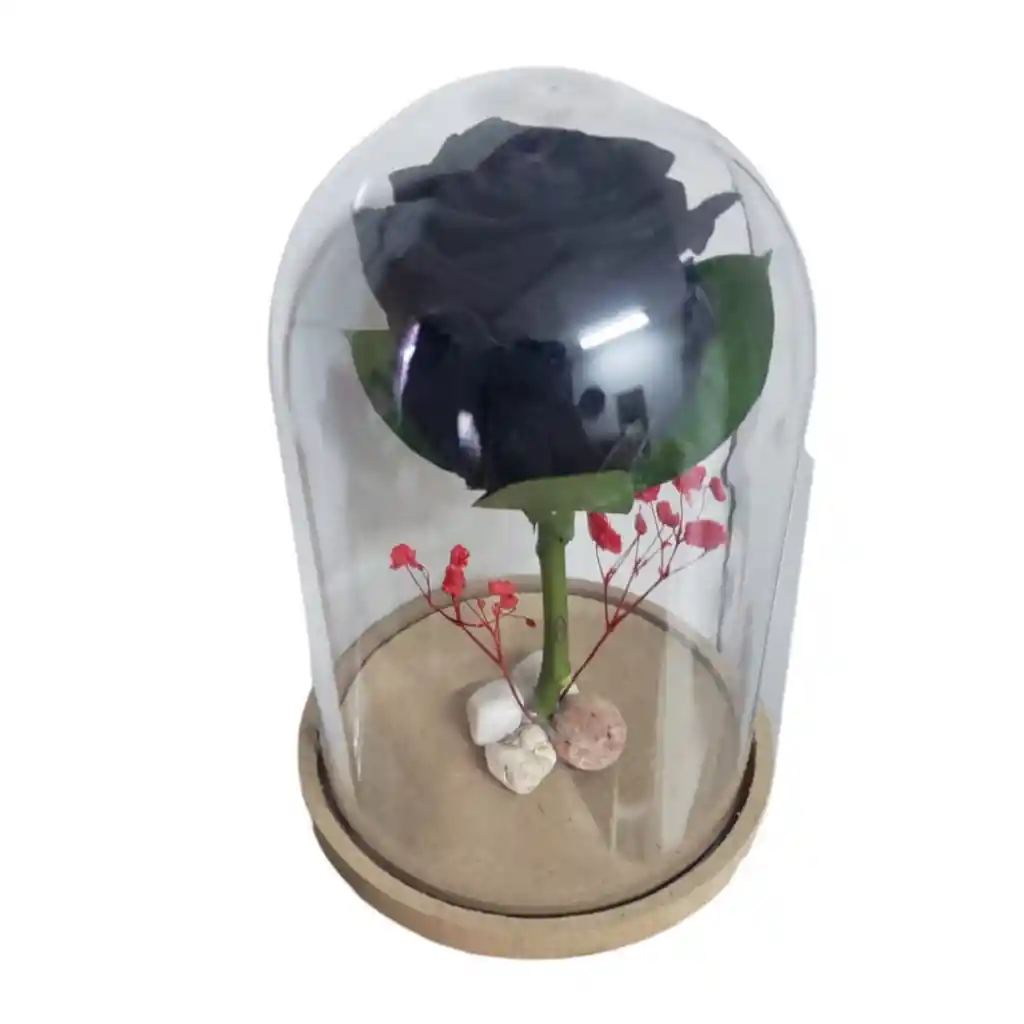 Capsula de vidrio con rosa preservada color negra, tamaño 15cm de alto por 11cm de ancho, viene en caja para regalo con instrucciones de cuidado. Las Rosas preservadas son rosas naturales que vienen desde ecuador en donde después de ser cosechadas pasan por un proceso de liofilización que les permiten estar vivas durante 5 años o más. Somos importadores directos.