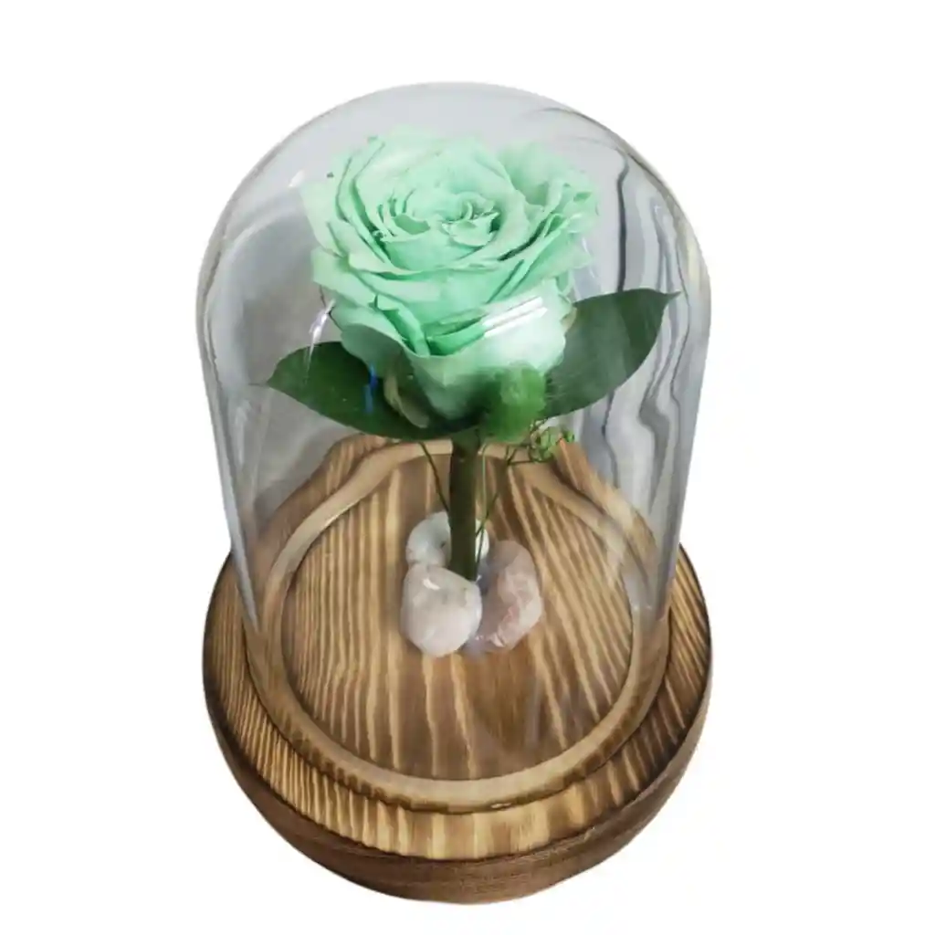 Capsula de vidrio con rosa preservada color Verde menta, tamaño 15cm de alto por 11cm de ancho, viene en caja para regalo con instrucciones de cuidado. Las Rosas preservadas son rosas naturales que vienen desde ecuador en donde después de ser cosechadas pasan por un proceso de liofilización que les permiten estar vivas durante 5 años o más. Somos importadores directos.