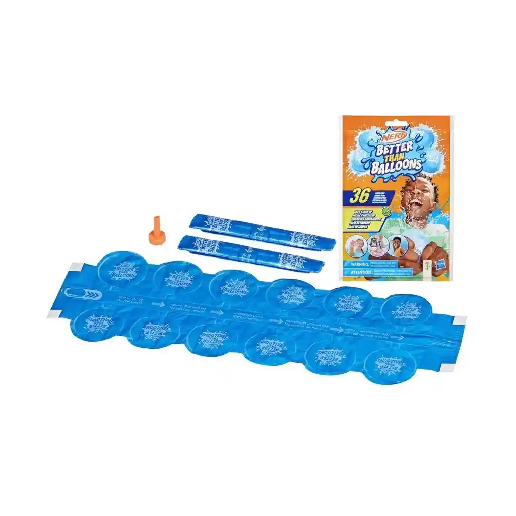 Cápsulas de Agua Better Than Ballons. ¡La alternativa a los globos de agua! ¡Lánzate a una revolución en los juegos acuáticos con las cápsulas Nerf Better Than Balloons y diviértete a lo grande al aire libre!. Características: ¡La marca Nerf Better Than Balloons es la revolucionaria alternativa a los globos de agua en los juegos acuáticos!. ¡Hay muchas maneras de jugar con estas coloridas cápsulas acuáticas! ¡Hazlas explotar, pisotéalas, lánzalas y aplástalas! Inventa todo tipo de juegos con estas versátiles cápsulas acuáticas que harán divertir a todos. Las cápsulas autosellables Nerf Better Than Balloons no se deshacen al estallar. Por tanto, cuando el juego termina, se pueden recoger fácil y rápidamente. No hay que buscar y recoger las piezas pequeñas, lo cual hace muy tediosa la limpieza una vez terminado el juego. Las cápsulas de agua vienen unidas en una lámina y se retiran fácilmente. Las láminas individuales te permiten decidir cuántas quieres usar. ¡Rellena algunas láminas para que disfrutes varios juegos o rellénalas todas para que te diviertas a lo grande! El diseño y el material hacen que sean resistentes al rellenarlas y evitan que se rompan por accidente. Incluye 36 cápsulas.