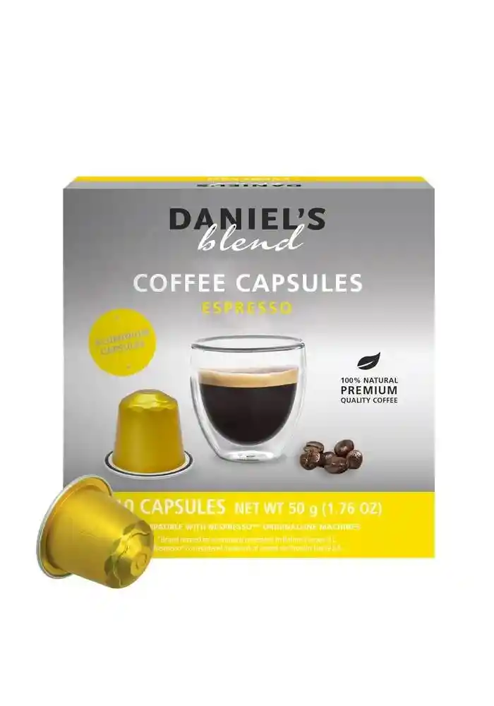 Daniel’s Blend Espresso para Nespresso Original Line (Línea Original). * Variedad: Espresso * Marca: Daniel’s Blend. * Descripción:Una mezcla equilibrada entre granos de Arábica y Robusta da como resultado un sabor único con matices dulces y achocolatados. Un clásico que no puede faltar en tu colección. * Intensidad: 8 * Compatibilidad: para máquinas Nespresso Original Line (Línea Original). NO son compatibles con Vertuo ni Dolce Gusto. * Presentación: Caja de 10 cápsulas de aluminio. * Origen: elaborado en España. * Ingredientes: Café molido, sin conservantes, sin azúcares ni aromas añadidos.