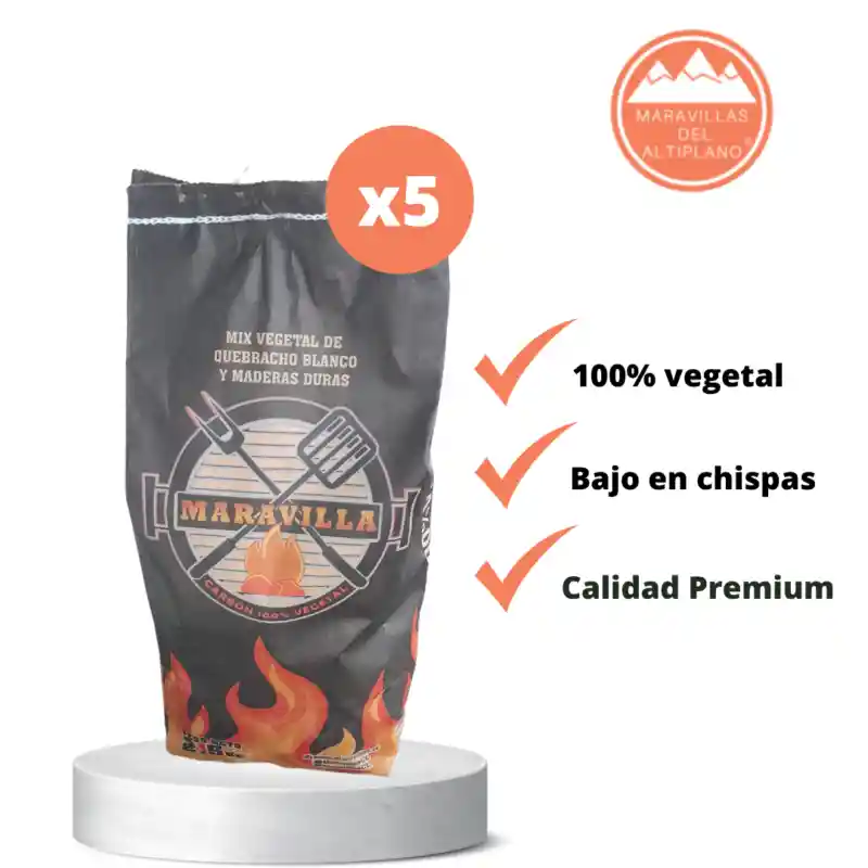 Mezcla de Quebracho Blanco 80% y Maderas Duras 20%, carbón de larga duración, no chispea y no emite humo, perfecto para tus asados. Pack de cinco bolsas