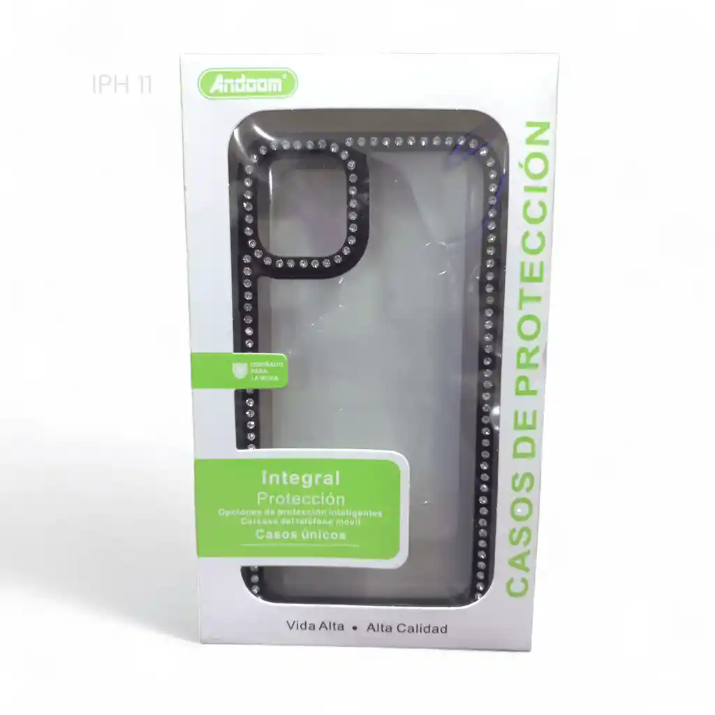 Carcasa transparente con brillos negros, diseñada para iPhone 11. Estilo sobrio con protección integral contra golpes y rayones.