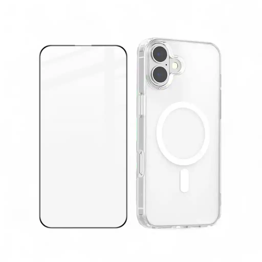Carcasa transparente con MagSafe más vidrio templado para iPhone 17 que ofrece protección completa en pantalla y cuerpo con ajuste perfecto.