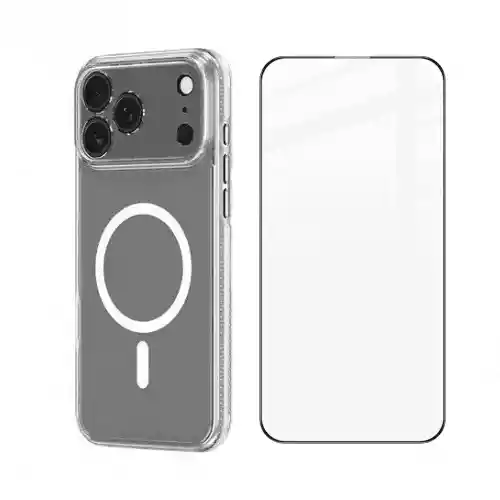 Carcasa transparente MagSafe con vidrio templado para iPhone 17 Pro que protege el equipo contra impactos y rayones manteniendo un diseño limpio.
