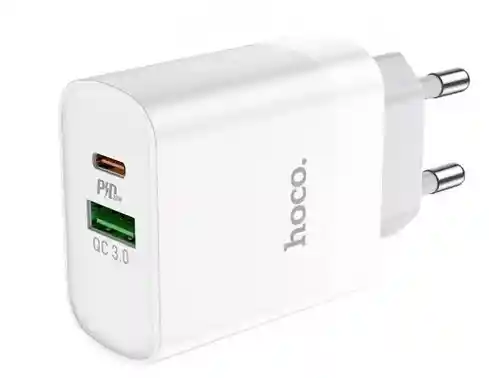 Cargador/Adaptador de pared de Carga Rápida de 20w, Con sistema 3.0 Quick Charge y chip inteligente que adapta el cargado del dispositivo de manera (Inteligente de 0% a 50% Mas Rápido) que los cargadores convencionales. y dispone de multi entradas, 1 entrada USB y una segunda entrada tipo C . (NO INCLUYE CABLE). MARCA: Hoco, Certificado. (SEC)
