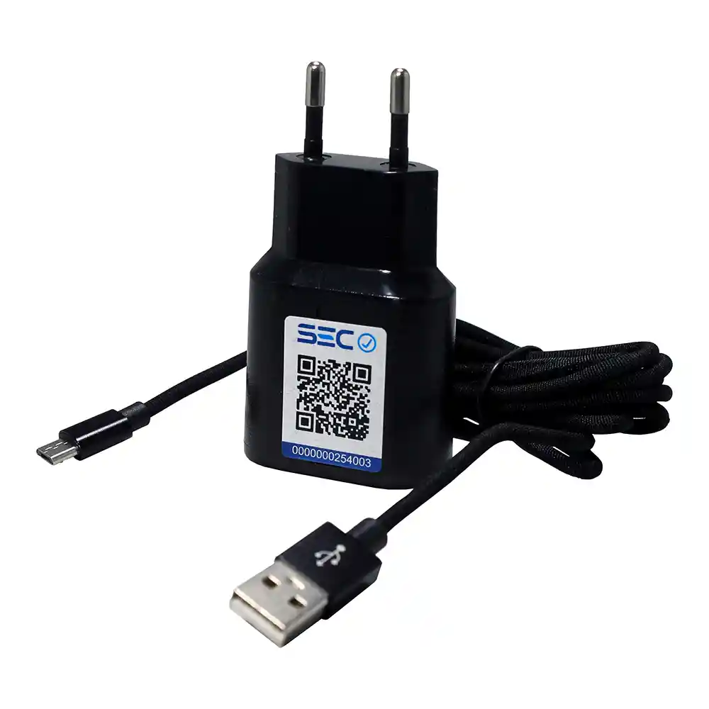 Cargador USB para Android certificado SEC Modelo: 2 en 1 Android Cargador USB con enchufe tipo EU (redondo) certificado Compacto, Fácil de guardar y transportar. Cable Micro USB para datos, Sincronización y carga 2100mAh. Largo: 2 Mts. Color: Negro. Cargador USB SEC: Entrada/input: 100V-240V. Salida/output: 5V