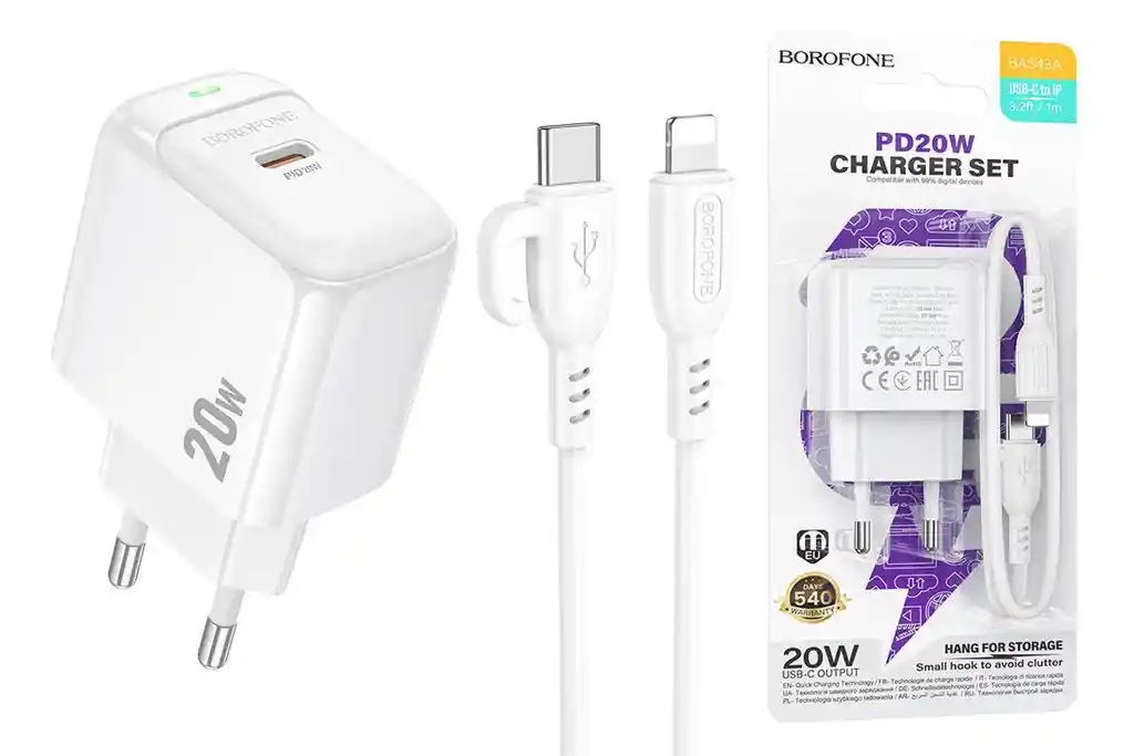 ⚡ Cargador Borofone BAS43A con Cable Lightning – Potencia Inteligente para tus Dispositivos Apple ¿Buscas cargar tu iPhone con seguridad y máxima velocidad? El Borofone BAS43A es el cargador ideal para ti. Con una salida USB-C de 20W, soporte para carga rápida Power Delivery y Quick Charge 3.0, y un cable Lightning de 1 metro incluido, este adaptador compacto está listo para cargar desde un iPhone SE hasta un iPhone 14 Pro Max sin complicaciones. Su diseño elegante en color blanco, carcasa de plástico ABS duradero, y enchufe europeo hacen de este cargador un compañero ideal en casa, la oficina o el bolso. Además, su compatibilidad con múltiples protocolos de carga lo convierte en una opción versátil para usuarios exigentes. 🔌 Características principales: ✅ Incluye cable Lightning de 1 metro ✅ Carga rápida de hasta 20W con PD/QC/FCP/AFC ✅ Compatible con iPhone 5 hasta iPhone 14 Pro Max y iPads ✅ Carcasa resistente de ABS + diseño compacto ✅ Salida USB-C de alto rendimiento ✅ Enchufe europeo estándar Este cargador Borofone no solo destaca por su velocidad, sino también por su diseño funcional y seguro. ¡Di adiós a las cargas lentas y dale a tu iPhone la energía que merece!
