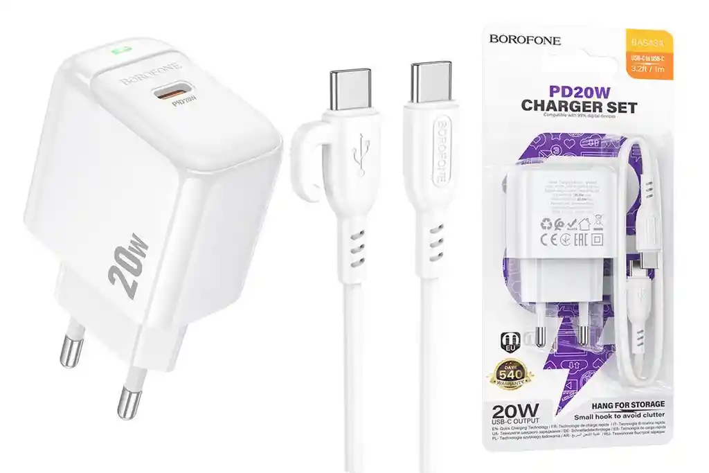 ⚡ Borofone BAS43A con Cable Tipo-C – Energía instantánea, diseño compacto Dile adiós a las cargas lentas con el Borofone BAS43A, un cargador de pared con carga rápida de 20W y cable Type-C a Type-C de 1 metro incluido. Gracias a su compatibilidad con Power Delivery, Quick Charge 3.0 y otros protocolos avanzados, podrás cargar tu smartphone, tablet o dispositivo portátil en mucho menos tiempo. Este cargador está fabricado en plástico ABS resistente, tiene un diseño elegante en color blanco y un tamaño compacto que lo hace perfecto para llevar en el bolso, mochila o maleta. Ideal para quienes buscan potencia, portabilidad y confianza en cada carga. 🔋 ¿Por qué elegirlo? 🚀 Carga turbo con 20W y soporte PD/QC3.0 🔌 Incluye cable USB-C a USB-C de 1 metro 💡 Ideal para dispositivos Android, tablets, powerbanks y más 🔒 Fabricado con materiales seguros, resistentes al calor ✈️ Compacto y ligero: perfecto para el día a día o viajes Llévalo contigo y mantén tus dispositivos siempre al 100%. El Borofone BAS43A es mucho más que un cargador: es tu nuevo aliado de carga rápida y segura.