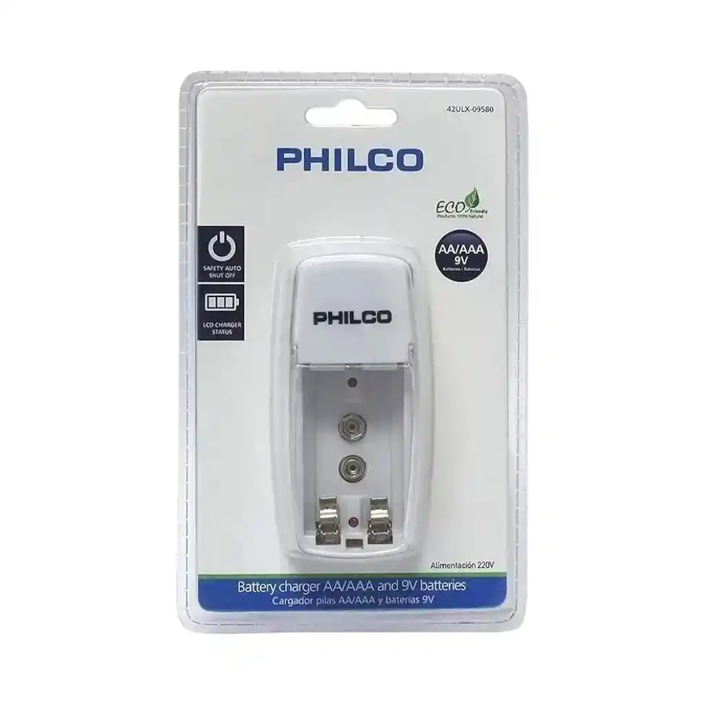 Cargador para Baterías Recargables Philco Modelo 42ULX-09580. Características Técnicas: Marca: Philco. Color: Blanco. Compatible con baterías recargables de 1.2V modelos AA, AAA y 9V de Ni-Cd o Ni-MH. Para cargar hasta 2 baterías AA / AAA al mismo tiempo o hasta 1 batería 9V. (Cargar pilas en serie). Indicador LED de Carga: ROJO = Carga en Proceso / APAGADO = Carga Completa. Voltaje nominal: 220v. Eco friendly. Contenido: 1 Cargador compatible con baterías recargables de 1.2V modelos AA, AAA y 9V de Ni-Cd o Ni-MH. Importante: No incluye baterías recargables. Recomendaciones: Para un mayor rendimiento descargue por completo y recargue en su totalidad las pilas cada 3 meses.