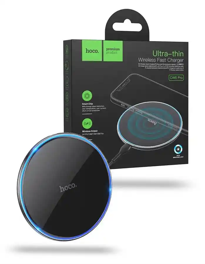 Cargador Inalámbrico Hoco CW6 Pro Easy 15W – Elegancia y Rendimiento Superior Experimenta la perfecta combinación de diseño moderno y tecnología avanzada con el cargador inalámbrico Hoco CW6 Pro Easy 15W, creado para satisfacer las necesidades de carga rápida y eficiente en tus dispositivos habilitados con tecnología Qi. Este cargador, con una potencia de hasta 15W, es ideal para smartphones, auriculares y otros accesorios compatibles. Su diseño ultradelgado de aleación de aluminio no solo lo hace liviano y portátil, sino que también le otorga un estilo sofisticado, perfecto para cualquier entorno. El Hoco CW6 Pro incorpora un práctico indicador LED de respiración, que proporciona información clara sobre el estado de la carga, además de agregar un toque de modernidad. Su sistema de protección inteligente previene sobrecargas, sobrecalentamientos y cortocircuitos, brindándote tranquilidad mientras cuidas tus dispositivos. Características principales: Carga inalámbrica rápida de 15W para dispositivos compatibles con tecnología Qi. Diseño ultradelgado y premium, fabricado en aleación de aluminio. Indicador LED de respiración para un monitoreo visual elegante. Sistema de protección múltiple para garantizar seguridad y estabilidad. Puerto USB-C y cable incluido de 1 metro para mayor versatilidad. Con el Hoco CW6 Pro Easy 15W, disfrutarás de una experiencia de carga práctica, segura y con estilo, tanto en casa como en la oficina. Este accesorio no solo es una solución tecnológica, sino un complemento estético que eleva tu espacio y simplifica tu día a día. ¡Optimiza tu carga inalámbrica con Hoco!