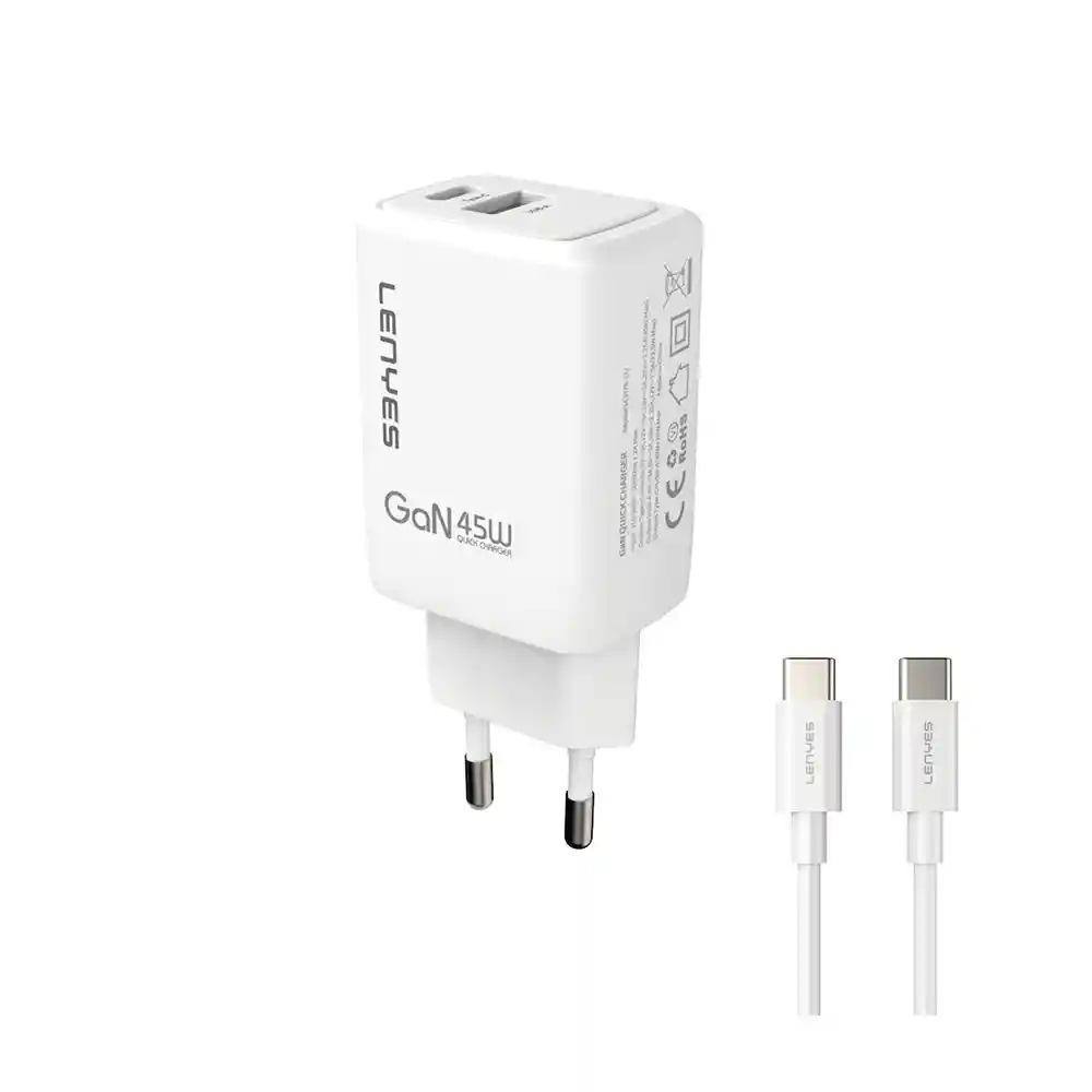 El cargador de pared TC-TC de 45W cuenta con dos puertos de carga USB/TC + cable tipo C a C . Este cargador es un dispositivo compacto y eficiente diseñado para proporcionar una carga rápida a tus dispositivos. Ideal para teléfonos inteligentes, tabletas y otros. Gracias a su potencia de 45W, el cargador proporciona una carga eficiente, reduciendo el tiempo de espera. También cuenta con medidas de protección contra sobrecarga, sobrecalentamiento y cortocircuitos para garantizar la seguridad de tus dispositivos.