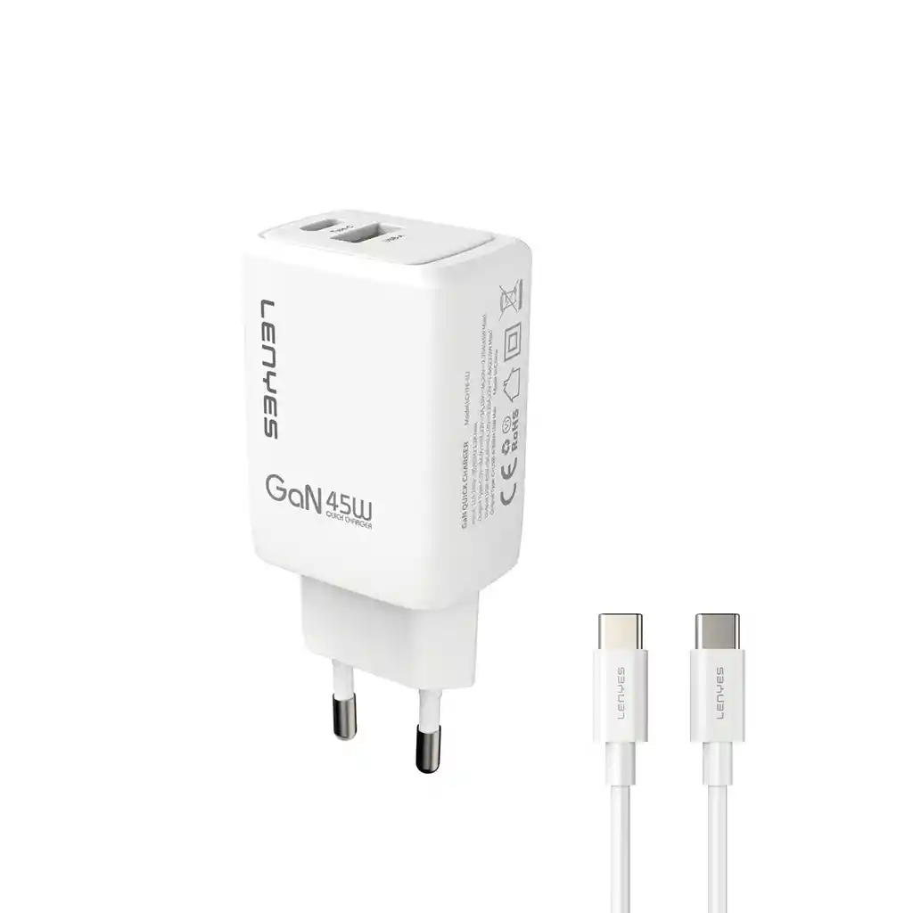 El Cargador Lenyes LCH76EUTC ofrece carga rápida y eficiente con una potencia máxima de 45W a través de su puerto USB-C. Su diseño compacto en color blanco es ideal para uso en casa, oficina o viajes. Cuenta con doble salida USB-C y USB-A, permitiendo cargar distintos dispositivos con estabilidad y seguridad. Es compatible con smartphones, tablets, notebooks y otros equipos que admitan carga rápida. Especificaciones técnicas: Modelo: LCH76EUTC. Tipo: Cargador de pared. Color: Blanco. Entrada AC: 110-240V 50/60Hz 1.2A máx. Salida USB-C: 5V/3A 9V/3A 12V/3A 20V/2.25A. Potencia máxima USB-C: 45W. Salida USB-A: 5V/3A 9V/2A 10V/2.25A 12V/1.5A. Potencia máxima USB-A: 22.5W. Potencia total combinada USB-C + USB-A: 30W + 15W. Compatibilidad: Dispositivos USB y USB-C con carga rápida.