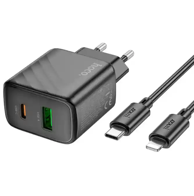 Cargador Hoco “CS23A Sunlight” PD30W Lightning CS23A Sunlight, cargador de pared con un puerto tipo C de 30 W y un puerto USB-A de 18 W, incluye cable de 1 m de tipo C a Lightning 1. Entrada: CA 100-240 V, 50/60 Hz, 0,8 A. 2. Salida: 1 × Tipo C: 5 V/3 A, 9 V/3 A, 12 V/2,5 A, 15 V/2 A, 20 V/1,5 A: 30 W máx. PPS: 3-11 V/3 A. 1 × USB-A: 5 V/3 A, 9 V/2 A, 12 V/1,5 A: 18 W máx. Salida total: Tipo C + USB-A = 5 V/3 A. 3. Enchufe nacional 4. Compatibilidad con protocolos de carga rápida: para protocolos de carga rápida PD30W/PPS/QC3.0/FCP/SCP/AFC.