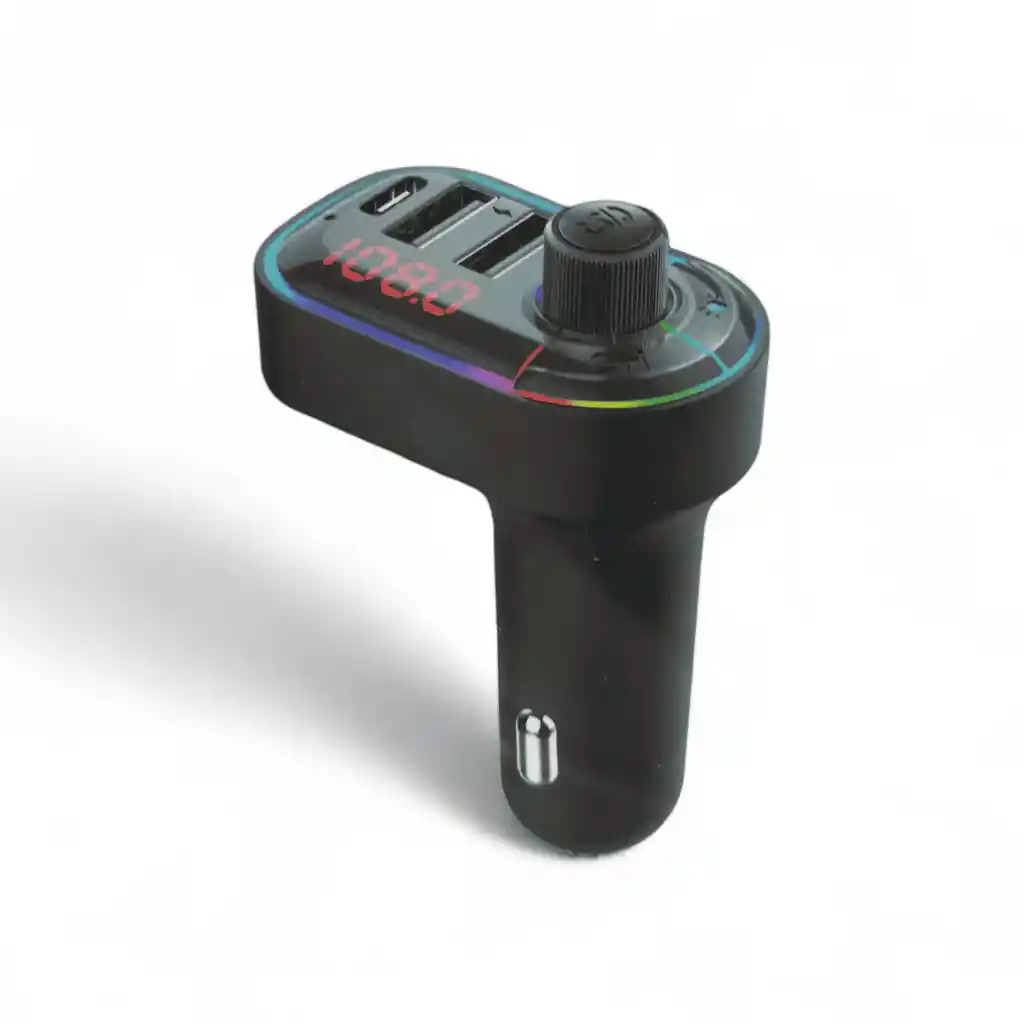 Cargador para auto con transmisor FM, pantalla digital, puertos USB y USB-C, control multifunción para música y llamadas manos libres.