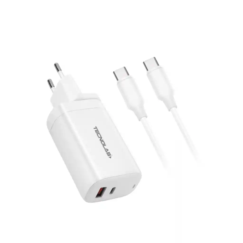 Cargador rapido QC 3.0 65W con cable USB C Blanco. El Cargador Rapido QC 3.0 65W de Tecnolab es la solucion definitiva para mantener todos tus dispositivos cargados de manera eficiente y segura. Este cargador de pared, que incluye tecnologia QC 3.0 y Power Delivery (PD), proporciona una carga rapida y potente de hasta 65W, ideal para notebooks, smartphones, tablets y mas. Con dos puertos USB, uno tipo A y otro tipo C, este cargador es versatil y ofrece una amplia compatibilidad con diversos dispositivos USB. Fabricado con materiales resistentes, el Cargador Rapido Tecnolab esta diseñado para durar. Incluye un cable Tipo C a Tipo C, asegurando una transferencia de energia rapida y estable. Ademas, cuenta con multiples protecciones integradas contra sobrevoltaje, sobrecalentamiento y cortocircuitos, garantizando la seguridad de tus dispositivos mientras se cargan. Este cargador es perfecto para quienes buscan una solucion confiable y eficiente para mantener sus dispositivos listos para usar en todo momento. El diseño compacto y elegante del Cargador Rapido QC 3.0 65W de Tecnolab lo hace facil de transportar y almacenar, ideal para el hogar, la oficina o los viajes. Su potente salida de 65W asegura que incluso los dispositivos mas exigentes se carguen rapidamente, mientras que la inclusion de un cable Tipo C a Tipo C añade comodidad y versatilidad. Con este cargador, despedirte de los tiempos de carga prolongados y los cables desordenados es una realidad, proporcionando una experiencia de carga optima y segura para todos tus dispositivos