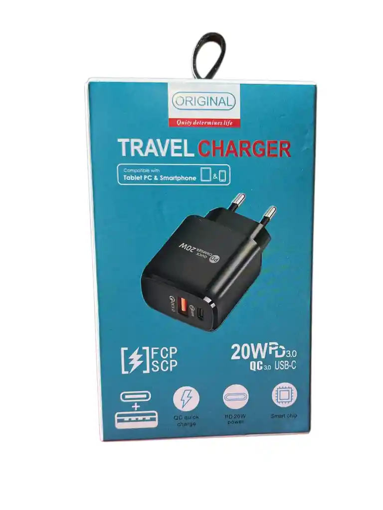 Cargador de pared 20W con puertos USB-C PD y USB QC 3.0. Compatible con smartphones y tablets.