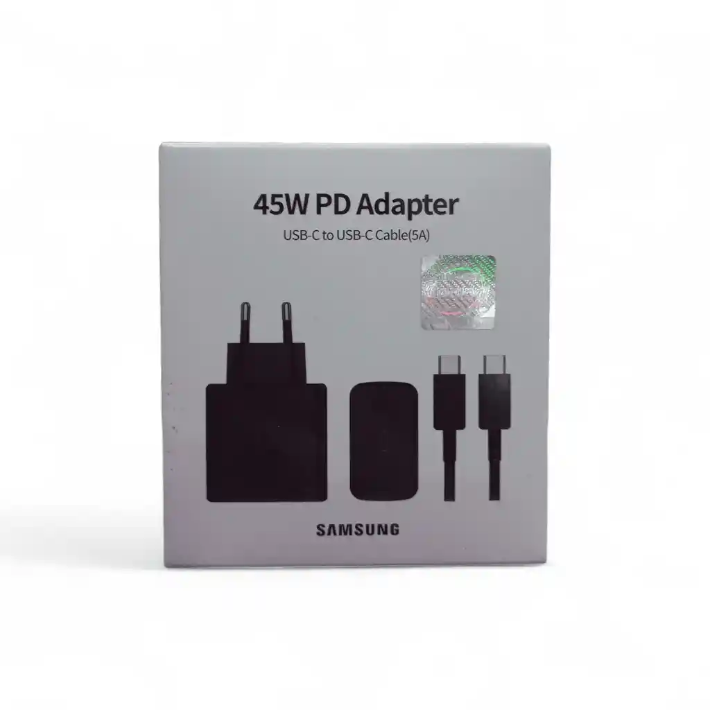 Cargador USB-C de 45W con tecnología PD para carga rápida de equipos compatibles.