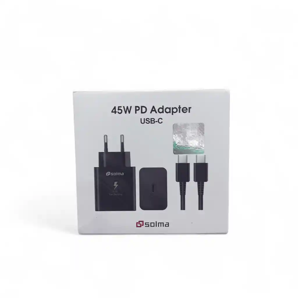 Cargador USB-C de 45W con tecnología PD, incluye cable para carga rápida y estable.