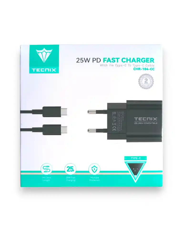 Cargador rápido de 25W con cable Tipo-C a Tipo-C incluido. Ideal para celulares y tablets de última generación.