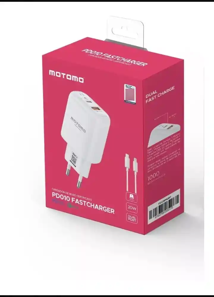 Cargador con protección de sobrecarga certificada SEC, incuye un cable USB A-tipo C y conector doble puerto.