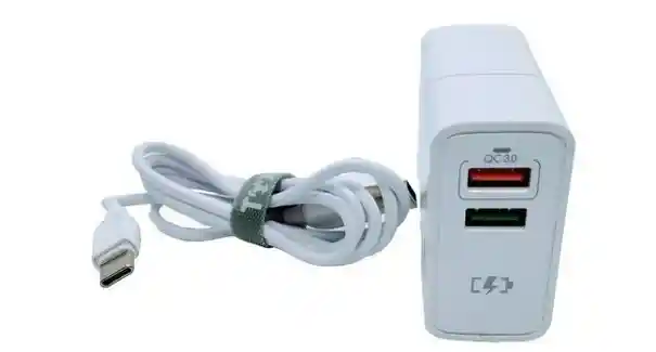 Cargador de pared que posee un circuito integrado que protege y carga dispositivos móviles rápidamente (2,1A carga máxima). Diseño compacto, ideal para usarlo en viajes o en casa. Posee 2 puertos USB permitiendo cargar 2 dispositivos a la vez. Compatible con TYPE C