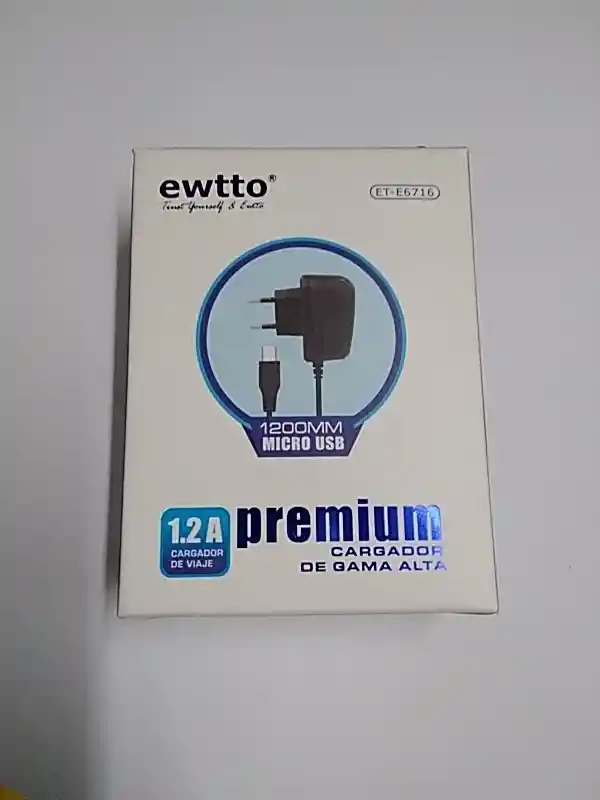 Cargador tipo micro usb. Incluye adaptador + cable. Color negro, marca ewtto. Largo del cable 1.2mts