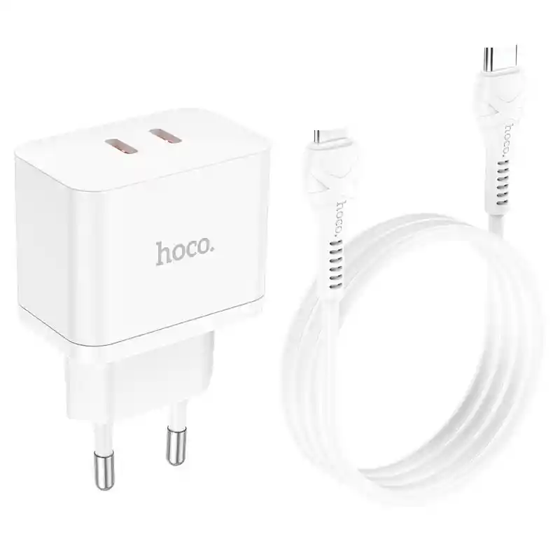 Apuesta por la Carga Super Rápida: por la velocidad, la seguridad, la estabilidad y la potencia. Súper rápida, segura y estable, no te conformes con menos: disfruta de la carga súper rápida para una amplia gama de productos tecnológicos esenciales, incluso para los iPhone. El cargador de doble puerto suficientemente potente para la carga simultánea de alto rendimiento. Experimenta la potente e inigualable excelencia del cargador de doble puerto. Cargue una amplia gama de dispositivos a su velocidad óptima ¿Androides? Por supuesto. ¡IOS tampoco es un problema! 1. Material: PC retardante de llama. 2. Salida: Tipo C 1/2 – 35W (para PD/para PPS/para QC/para FCP/para AFC). Salida total: Tipo C1 + Tipo C2 = 17,5 W + 17,5 W. 3. Enchufe europeo. 4. Tamaños: 74*45*28mm. Peso del cargador único: 61,3 g. Peso del juego con cable: 85,3g. 5. Configure con un cable de 1 m tipo-c a tipo-c 6. Marca: (HOCO PREMIUM)