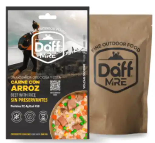 Carne con Arroz en formatos pouch de 260 grs. Alimento práctico para transportar en tu mochila o equipaje, y fácil de manipular al momento de consumir el contenido, gracias a su envase doypack que puedes apoyar de forma vertical sobre cualquier superficie. No requiere refrigeración, es de larga duración y muy fácil de calentar. Opciones para Calentar: Baño María. Calentador Autónomo Daff. (10-12 minutos) Ingredientes: Agua, carne de vacuno, arroz, aceite vegetal refinado de maravilla, zanahoria, choclo, arvejas, cebolla, condimento carbonada de carne, ajo en polvo, sal. Información Nutricional: