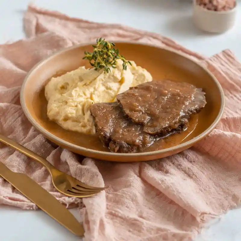 Carne de Vacuno Braseada, acompañada de Puré en base a Palmitos Keto, bajo en carbohidratos 100% artesanal, sin conservantes ni preservantes Contiene Lácteos