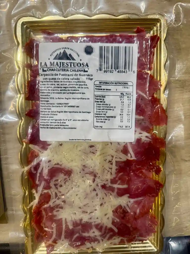Carpaccio de Pastrami de Guanaco con Queso de Cabra – La Majestuosa (115g) Una creación artesanal de Charcutería La Majestuosa, elaborada en Santiago bajo tradición familiar. Finas láminas de pastrami de guanaco, intenso y delicado a la vez, se combinan con la suavidad cremosa del queso de cabra, logrando un carpaccio sofisticado y lleno de carácter. Perfecto para servir como entrada gourmet, en tablas de charcutería o acompañado de panes artesanales y un buen vino. ✨ Formato: 115 g listo para servir 🦌 Carne magra de guanaco curada y especiada 🧀 Queso de cabra cremoso y equilibrado 🥂 Ideal como entrada o en tablas gourmet