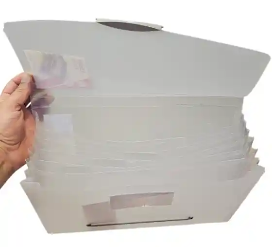 Maletín con compartimentos cerrados con goma elástica. Fabricado en PP translúcido de 0,67 mm de espesor. Contiene 6 divisores ampliables con índices. Hay un bolsillo para tarjetas de visita en la portada. Capacidad para 300 hojas A4 (80 g/m2) Etiqueta de estilo VIVIDA en el lomo. Dimensiones 330 x 260 x 25 mm color blanco
