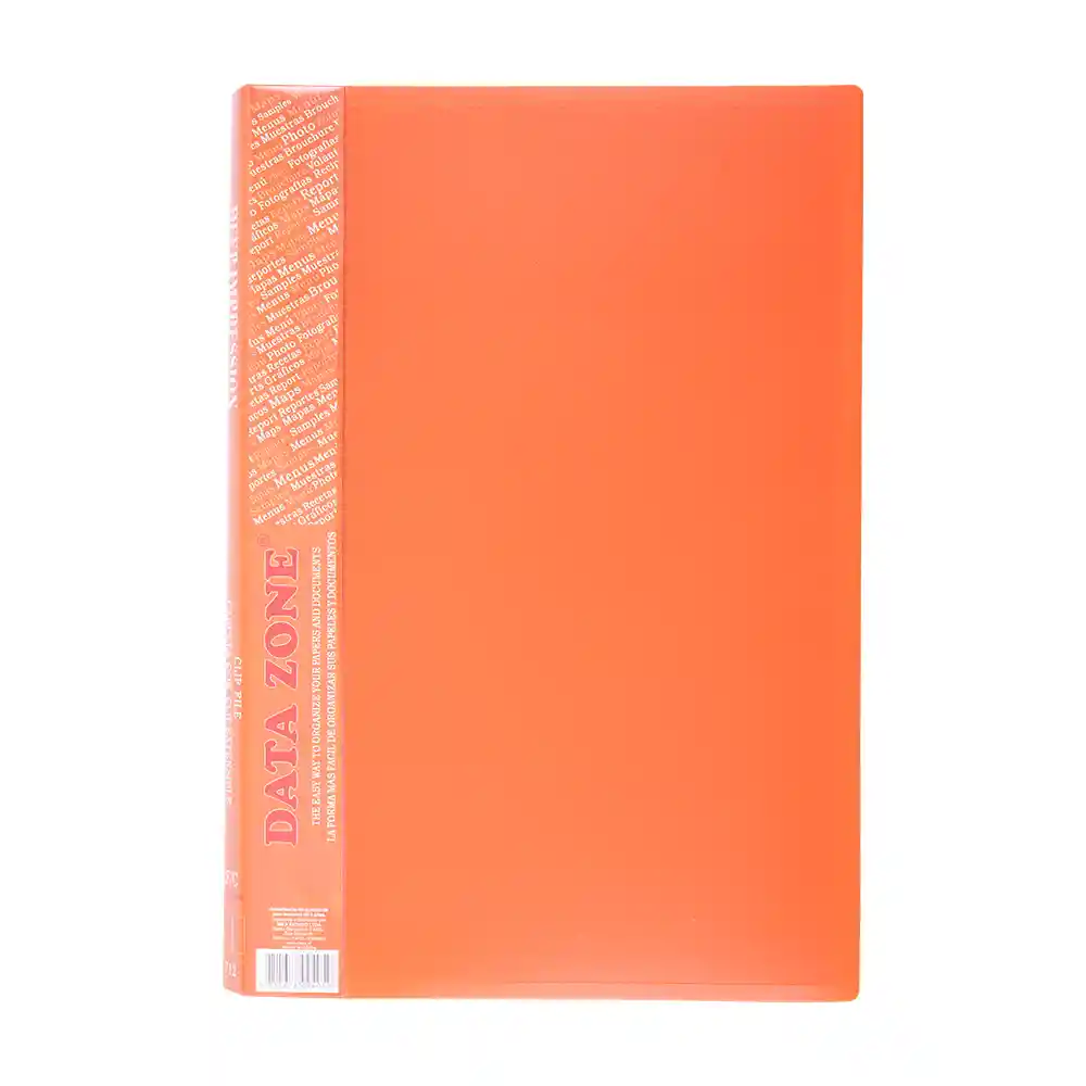 Carpeta de polipropileno con clip gusano color naranjo. Tamaño oficio. Capacidad 130 hojas, con bolsillo interno y lomo plástico para identificación.