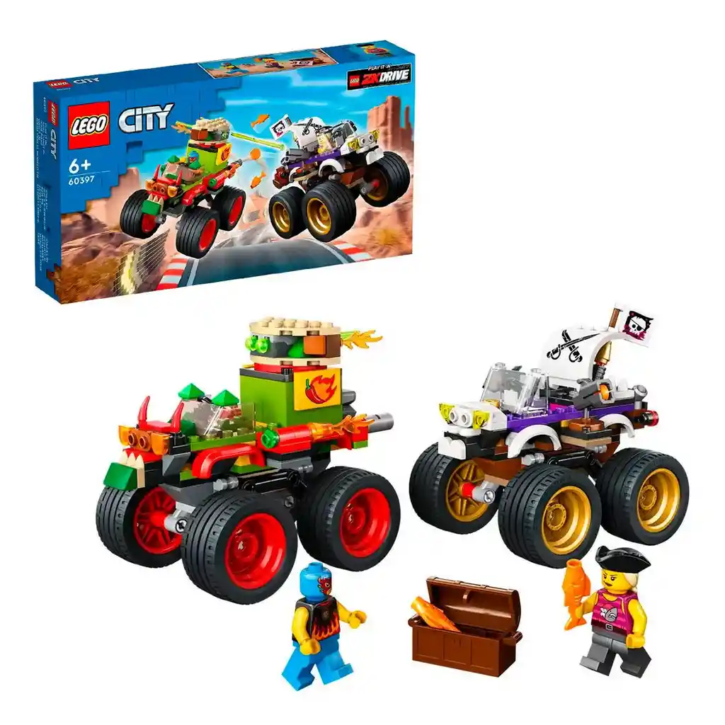 A los fans de los coches de juguete y del videojuego LEGO® 2KDRIVE les esperan infinitas horas de diversión con el set City Carrera de Camiones Monstruo (60397) para mayores de 7 años, que incluye 2 graciosos camiones monstruo con fantásticas funciones, como en el videojuego. Los niños podrán disfrutar de la acción de 2KDRIVE en el mundo real u organizar sus propias competiciones entre las minifiguras del conductor de los tacos y del conductor pirata. Experiencia de construcción interactiva Este set viene con una guía de construcción visual fácil de seguir e instrucciones paso a paso en la app LEGO Builder, una ayuda intuitiva que permite a los peques visualizar sus modelos en 3D, controlar su avance en el proceso de construcción, y explorar y guardar sets virtuales. Juguetes con los niños como protagonistas Con los sets LEGO City, los peques deciden las historias. Sus detalladas estructuras, geniales vehículos e inspiradores personajes estimulan el juego imaginativo sin límites. • Divertidas carreras a todo gas: Los peques podrán disfrutar de la acción del videojuego LEGO® 2KDRIVE en el mundo real u organizar sus propias competiciones con el juego de juguetes City Carrera de Camiones Monstruo (60397). • ¿Qué contiene la caja? Todo lo que los niños necesitan para construir camiones monstruo de juguete, cada uno de un tema (tacos y piratas), además de 2 minifiguras de conductores, como en el videojuego LEGO® 2KDRIVE. • Características y funciones: Los peques pueden incorporar las mejoras a sus coches de carreras de juguete y personalizarlos intercambiando los módulos delanteros y traseros. • Graciosos detalles: Arroja elementos LEGO® con el lanzador de guacamole o vacía el cofre del tesoro, que contiene un pez de juguete, para frenar a tu oponente y ganar la carrera. • Un regalo para cualquier ocasión: Este set basado en competiciones entre camiones monstruo es un divertido regalo de cumpleaños, por las fiestas o solo porque sí para niños, niñas y fans de jugar a las carreras a partir de 7 años. • Dimensiones: El camión monstruo de los tacos mide aproximadamente 10 cm de altura, 12 cm de longitud y 8 cm de anchura. • Accesorios de juguete para ampliar las posibilidades de juego: El set incluye 2 lanzadores de elementos LEGO® acoplables, 4 elementos arrojadizos, un cofre del tesoro pirata y una figura de un pez. • Guía interactiva: Descubre la intuitiva app LEGO® Builder. Con ella, los peques pueden acercar y girar los modelos en 3D, controlar su avance en el proceso de construcción, y explorar y guardar sets virtuales. • Acción sin límites: Da rienda suelta a más diversión y aventuras combinando este set con otros de la gama LEGO® City. • Juguetes de confianza: Todos los componentes LEGO® cumplen estrictas normas del sector, por lo que ofrecen siempre las mismas cualidades, son compatibles entre sí y proporcionan una divertida experiencia de construcción; así ha sido desde 1958. • Pruebas exhaustivas: Los elementos y ladrillos LEGO® se dejan caer, se calientan, se aplastan, se retuercen y se analizan para verificar que satisfacen rigurosos estándares mundiales de seguridad."