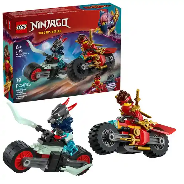 El juego Carrera Relámpago en Moto de Kai (71838) para niños y niñas a partir de 6 años les permite recrear trepidantes escenas de la temporada 3 de la serie para televisión NINJAGO®: El Renacer de los Dragones. Este emocionante set cuenta con 2 motos ninja: la moto de carreras de Kai, adornada con 2 dagas, y la endiablada moto del infame explorador Dragónido Espectral. El set, además de los vehículos ninja, trae 2 minifiguras NINJAGO para pilotarlos: Kai (armado con una espada reveladora translúcida y 2 catanas doradas) y un explorador Dragónido Espectral (con una espada) para pasarlo genial imaginando batallas del bien contra el mal y jugando a solas o con amigos. Los sets y juguetes ninja LEGO® NINJAGO construibles para niños incluyendragones, vehículos y templos que les ofrecen la oportunidad de interpretar aventuras con sus héroes. Tu peque puede crear cada juego ninja con la app LEGO Builder, su guía en una intuitiva experiencia de construcción. El set contiene 79 piezas. Vehículos para peques: Los niños y las niñas a partir de 6 años podrán interpretar las escenas de carreras y de combate de la temporada 3 de la serie para televisión NINJAGO®: El Renacer de los Dragones con el juego Carrera Relámpago en Moto de Kai 2 motos ninja de juguete con ruedas móviles: Este emocionante set de combate incluye la moto de carreras de Kai, adornada con 2 dagas, y la endiablada moto del explorador Dragónido Espectral 2 minifiguras NINJAGO®: Para interpretar aventuras pilotando las motos de juguete, el set cuenta con el guerrero ninja Kai y con el infame explorador Dragónido Espectral Armas ninja: Kai está armado con elementos que representan una espada reveladora translúcida y 2 catanas doradas, y el explorador Dragónido Espectral lleva un accesorio que representa una espada Regalito para niños y niñas: Este juguete de aventuras proporciona una divertida experiencia de construcción y juego, y es perfecto como regalo solo porque sí para peques que disfrutan formando equipo con sus amigos y sus héroes ninja Amplía las aventuras ninja: Descubre más juguetes LEGO® NINJAGO® (sets a la venta por separado) para añadir más emoción a la Carrera Relámpago en Moto de Kai Un universo de juguetes ninja: Los sets LEGO® NINJAGO® transportan a los niños a un mundo de fantasía lleno de aventuras con sus héroes ninja Medidas: La moto ninja de Kai que contiene este set de construcción LEGO® de 79 piezas para niños y niñas mide aproximadamente 4 cm de altura, 9 cm delongitud y 3 cm de anchura