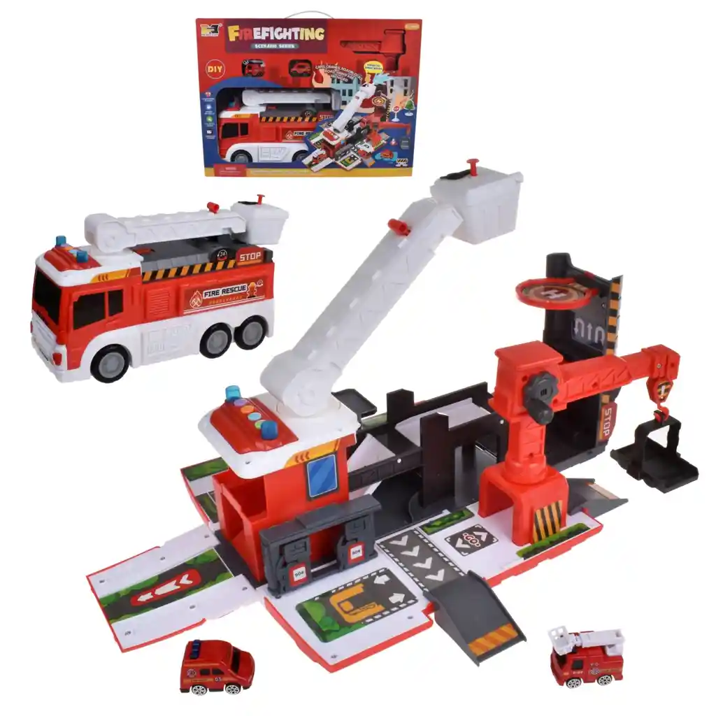 ¿Te imaginas tener un camión que cumpla tres fabulosas funciones? Tenemos para ti todo eso y más. Este fantástico Camión de Bomberos se puede transformar en un Playset que incluye una entretenida pista de carreras, con un moderno helipuerto y una emocionante estación de bomberos. Es muy fácil de armar y desarmar, por lo que puedes transformarlo en cualquier momento y en cualquier lugar, además está diseñado con detalles auténticos y realistas como ruedas de acción libre y lanzador de agua. Incluye 2 vehículos de bomberos y una gran variedad de accesorios.