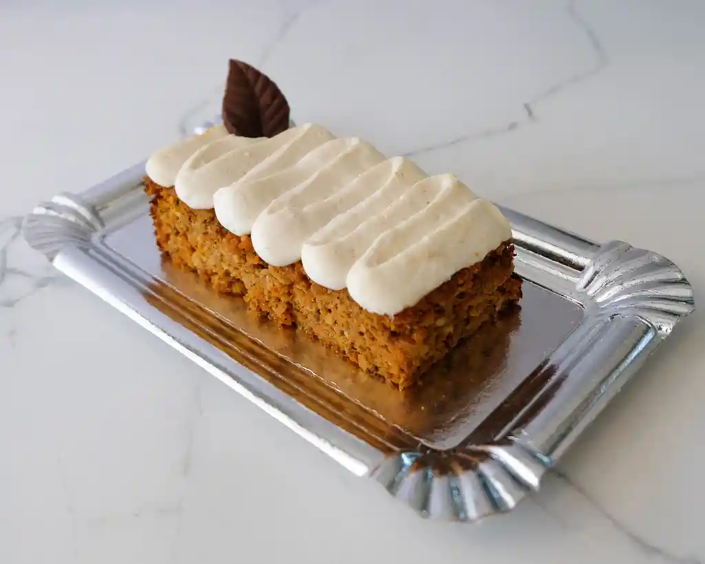 Queque húmedo de zanahoria, almendras y dátiles con un toque de nuez moscada, cubierto con frosting de queso crema vainilla. 204 kcal por porción.