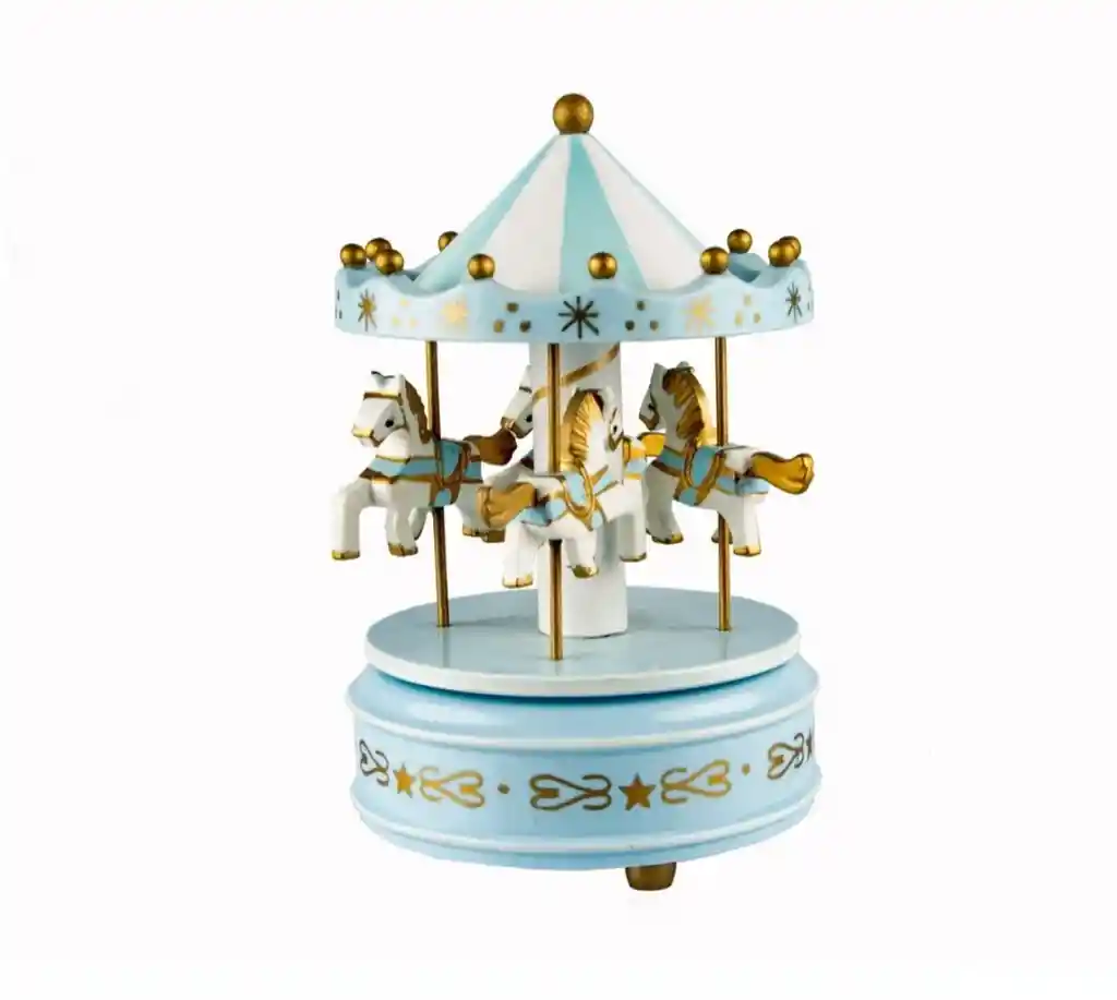 Carrusel musical de colores de madera para decorar y jugar. Este carrusel musical será perfecta para regalar a alguien o decorar tu hogar con una musical! Además se verán estupendo como decoración! Caja musical carrusel de base madera con detalles de plásticos de varios colores. La caja musical cuenta con 6 diferentes colores para elegir. Debe girar el carrusel por un lado y comienza a girar automáticamente con su musica. Material: Plastico y madera Medidas: Alto: 16cm Profundidad: 11cm Largo: 11cm