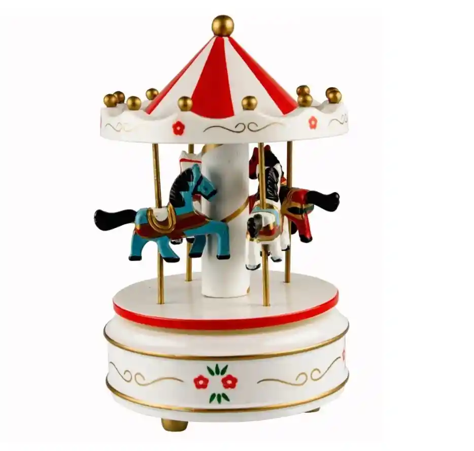 Carrusel musical de colores de madera para decorar y jugar. Este carrusel musical será perfecta para regalar a alguien o decorar tu hogar con una musical! Además se verán estupendo como decoración! Caja musical carrusel de base madera con detalles de plásticos de varios colores. La caja musical cuenta con 6 diferentes colores para elegir. Debe girar el carrusel por un lado y comienza a girar automáticamente con su musica. Material: Plastico y madera Medidas: Alto: 16cm Profundidad: 11cm Largo: 11cm