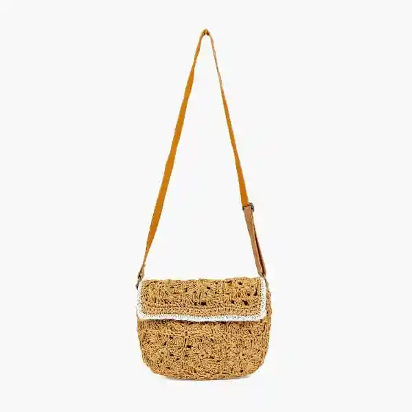 Cartera cruzada con detalles de gamuza. Abre con botón. El bolsillo principal es con cierre. En el interior tiene un bolsillo pequeño con cierre.