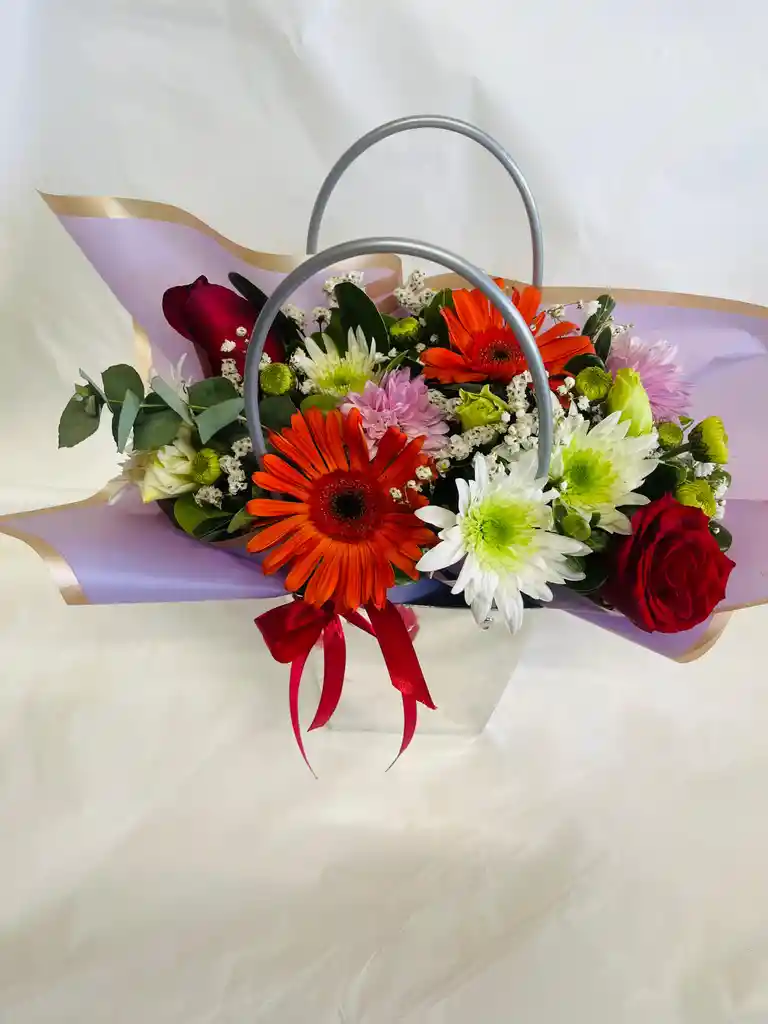 hermosa cartera de 2 rosas rojas con 2 gerberas naranjas, mable variado y gypso
