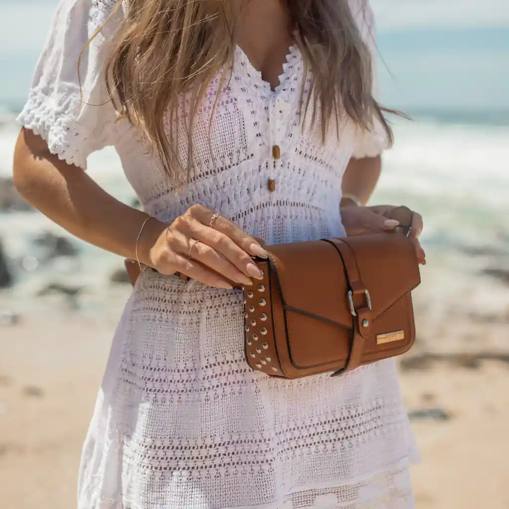 - Producto: Cartera (cartera-riñonera). - Medidas: 12 cm de alto (vertical), 19 cm de largo (horizontal) y 6 cm de ancho (profundidad). La correa de la cadera mide 115 cm y el strap para colgar 105 cm. - Material y descripción: Hecha en cuero vegano PU camel mate, con tachas plateadas laterales. Incluye una correa para usar como riñonera, una cadena para usar como cartera y un strap de regalo de animal print.