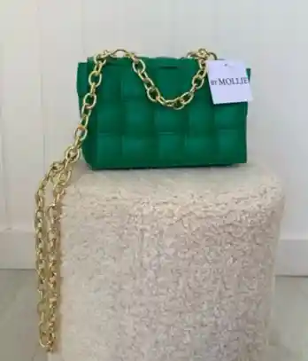 Hecha con cuero tejido y vegano y con dos cadenas de oro con longitudes alternativas para el uso.