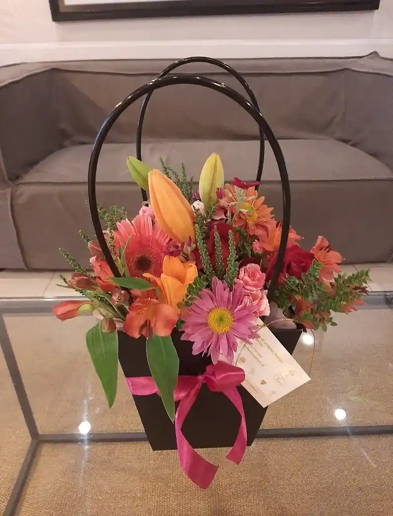 Arreglo en base de cartera negra, compuestas por surtido de flores segun stock, con toque de follaje verde.