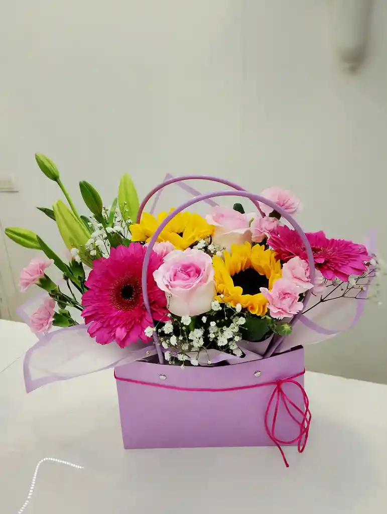 Hermosa carterita multicolor especial para cumpleaños Incluye : Rosas, Gerberas, Girasoles, Lilium