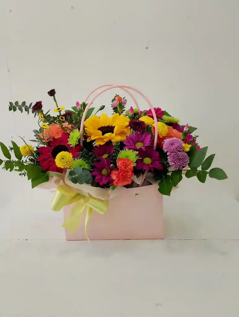 Alegre carterita multicolor especial para dar una sorpresa y alegría a quien lo recibe. Incluye : - Girasol, Rosas, Gerbera - Surtido de flores de estación - 1 Tarjetita para mensaje .