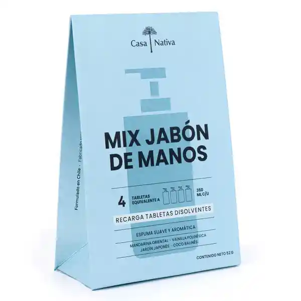 Contiene 4 Variedades de Recargas de Jabón Espuma. Contiene 1 Tableta de Jabón Espuma Jardín Japonés 1 Tableta de Jabón Espuma Coco Balinés 1 Tableta de Jabón Espuma Mandarina Oriental y 1 Tableta de Jabón Espuma Vainilla Polinésica.