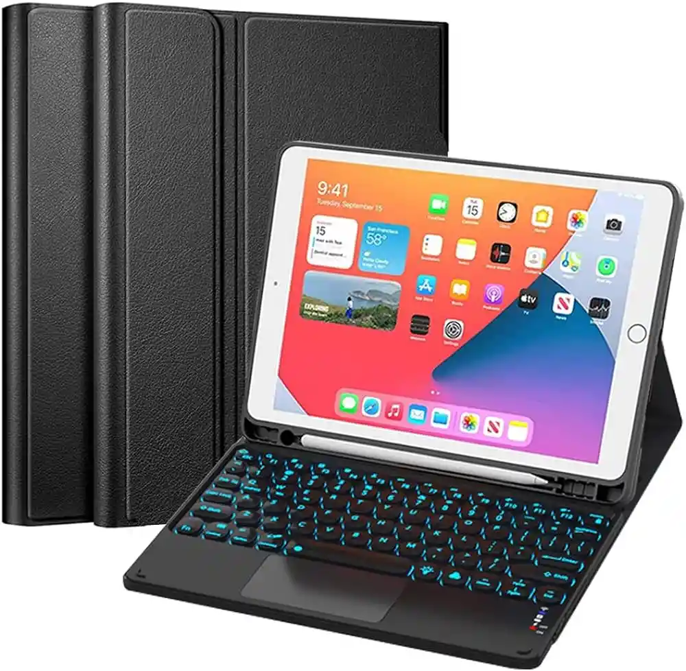 Esta Carcasa + teclado + Touchpad protege tu iPad de rayones, golpes y polvo. Incluye un teclado permitiendo escribir con facilidad. El teclado se conecta via Bluetooth® y sus teclas usan el formato de isla similar al de los computadores portátiles para que puedas escribir de forma natural. Y además se pliega como una base de apoyo para ver películas documentos y fotos de cómodamente. TECLADO EN ESPAÑOL CONTIENE LA LETRA Ñ. Escribe igual que en una láptop Sus cómodas teclas con estilo de isla te permiten escribir de forma idéntica a un computador portátil para que puedas enviar mensajes escribir blogs editar documentos y tomar notas de forma fácil.