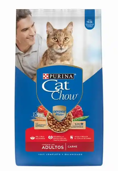 El Nuevo Purina Cat Chow Adultos Delicias Sabor Carne Con Defense Plus Ofrece Los Nutrientes Que tu Gato Necesita Para Mantenerse Fuerte y Saludable. Su Formula Contiene Entre Sus Ingredientes Proteínas de la Carne Naturalmente Ricas en Hierro Que lo Ayudan a Desarrollar Músculos Fuertes. Ingredientes Maíz Harina de Gluten de Maíz Harina de Subproductos de Pollo Harina de Soja Harina de Carne y Hueso Vacuna Grasa Vacuna y/o Grasa Porcina y/o Aceite de Pollo Preservados Con Tocoferoles Mezclados (Fuente de Vitamina e) Arroz Cervecero y/o Trigo Integral Digesto Animal (A Base de Subproductos Pollo y/o Porcino) Ácido Fosfórico y/o Bisulfato de Sodio Sal Pirofosfato Tetrasodico Carbonato de Calcio Cloruro de Potasio Cloruro de Colina Taurina Dl-Metionina L-Lisina Vitamina e Acido Ascórbico (Fuente de Vitamina C) Niacina Suplementos Vitamínicos (E a B-12 D-3) Pantotenato de Calcio Suplemento de Riboflavina Biotina Ácido Fólico Mononitrato de Tiamina Clorhidrato de Piridoxina Complejo Menadiona Sódica Bisulfito (Fuente de Actividad de Vitamina K) Sulfato de Zinc Proteinato de Zinc Sulfato Ferroso Sulfato de Manganeso Proteinato de Manganeso Sulfato de Cobre Proteinato de Cobre Iodato de Calcio Selenito de Sodio Colorantes Agregados (Rojo 40 Amarillo 5 y Azul 2).