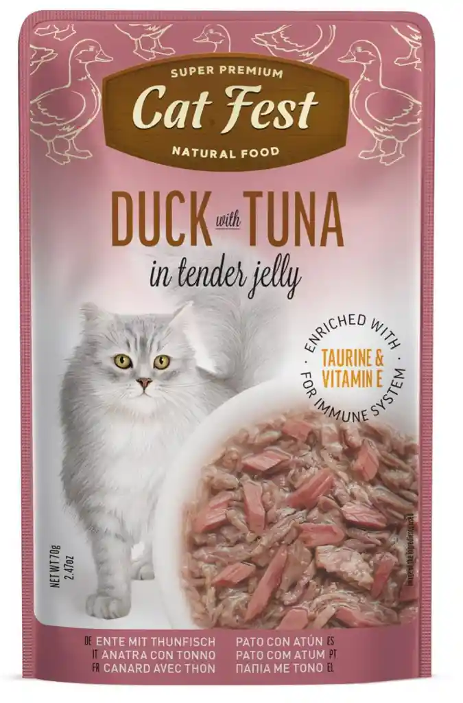 Cat Fest Pato con Atún en Gelatina Tierna es una elección ideal para quienes desean brindar una alimentación deliciosa, equilibrada y funcional a sus gatos adultos. Esta variedad combina el sabor intenso del pato con la frescura del atún, creando una experiencia culinaria que deleita hasta a los gatos más exigentes. Su fórmula, rica en proteínas de alta calidad y nutrientes esenciales, contribuye a una vida saludable, activa y feliz para tu felino.