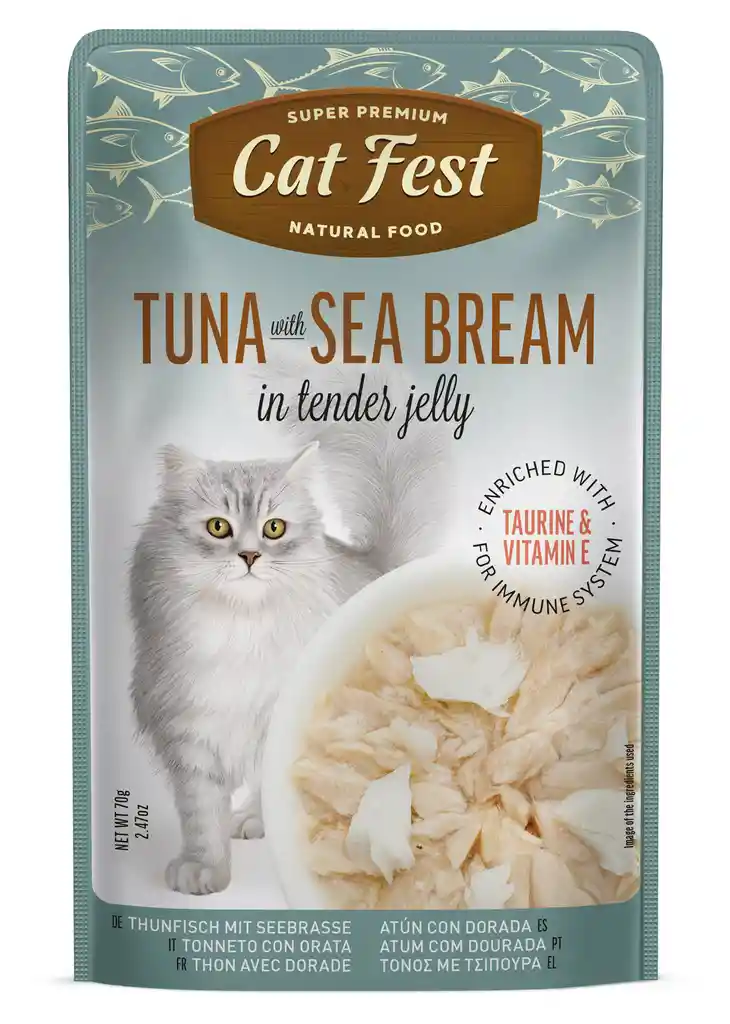 Cat fest es una exquisita comida de atún y dorado le dará a su mascota un verdadero disfrute del sabor de las delicias del Pacífico. La tierna gelatina complementa armoniosamente la textura y el sabor del pescado fresco, creando un plato perfecto para gatos gourmet. Servido como alimento natural complementario. Al ser rico en ácidos grasos esenciales omega-3, el atún promueve buena salud de la piel y el pelaje en los gatos y tiene propiedades antiinflamatorias Propiedades. Es bajo en hidratos de carbono, por lo que es ideal para control de peso y reducción de los riesgos para la salud asociados con sobrepeso. Su tentador aroma y sabor hace que Es irresistible para los gatos.